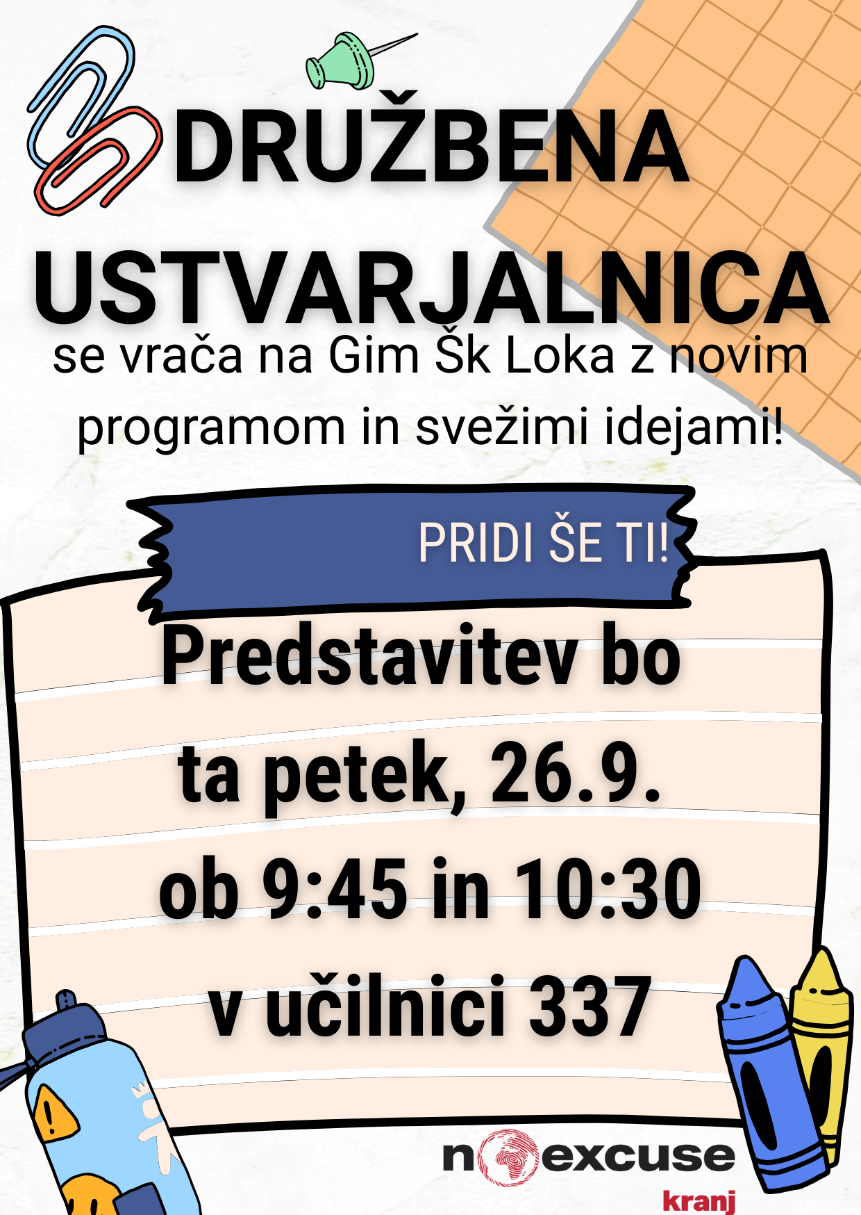 Družbena ustvarjalnica 2025/26 22. september 2025 Družbena ustvarjalnica se z novim programom in svežimi idejami vrača na Gimnazijo Škofja Loka. Pridi še ti! Predstavitev bo ta petek, 26. 9., ob 9.45 in 10.30 v učilnici 337. Lara Mayland