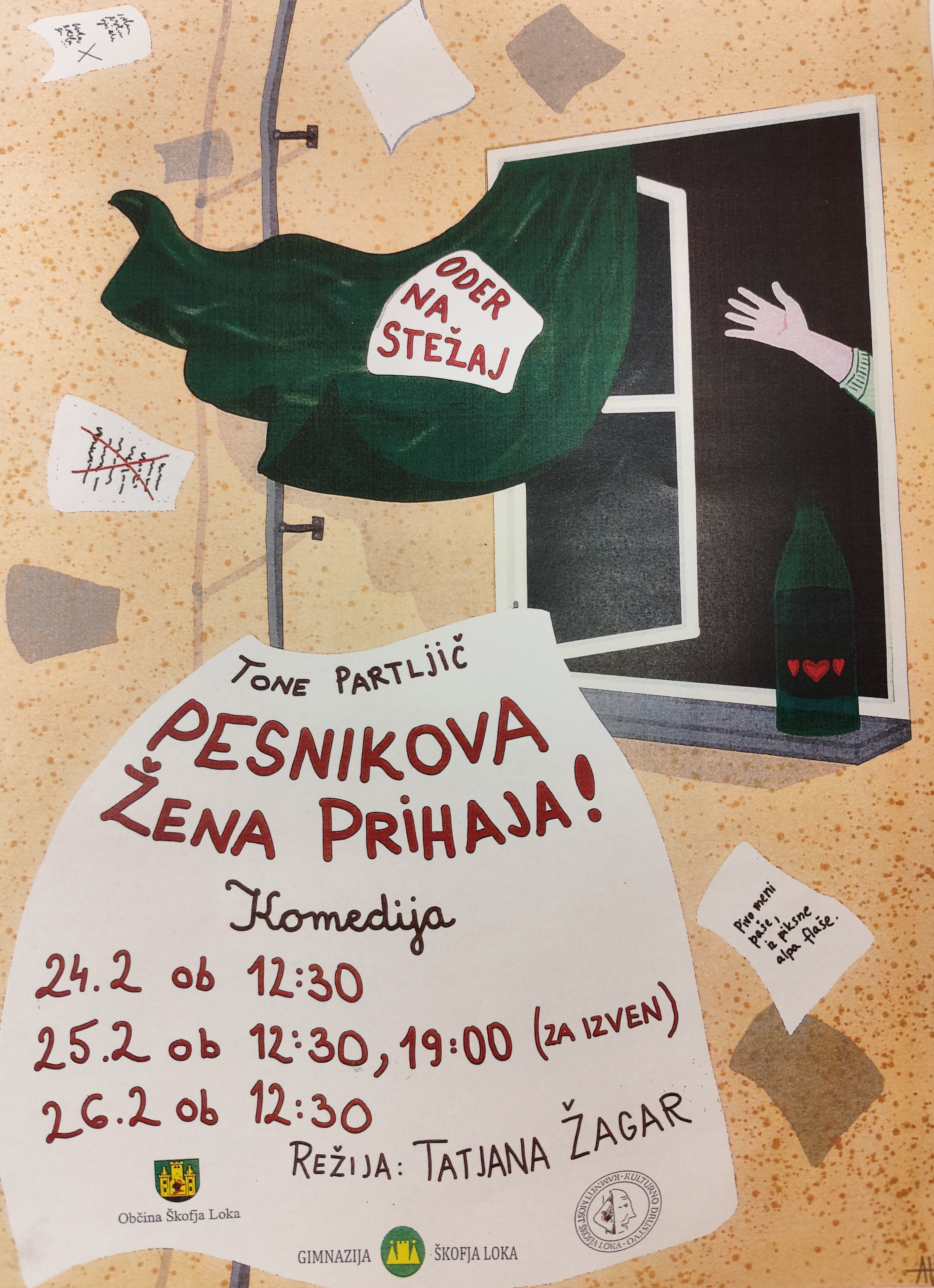 Z veseljem vas vabim na predstavo gimnazijske gledališke skupine Oder na stežaj. V režiji profesorice slovenščine Tatjane Žagar nam bodo na Loškem odru odigrali komedijo Toneta Partljiča Pesnikova žena prihaja.