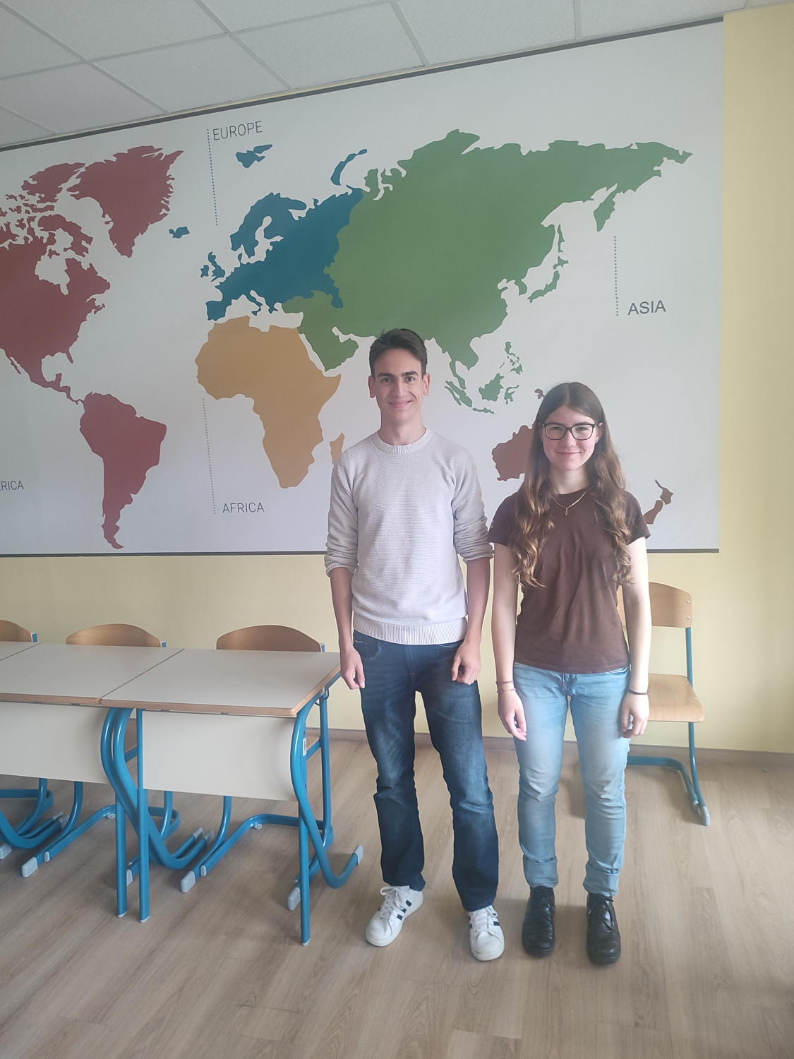 V soboto, 28. 3. 2026, je v Slovenski Bistrici potekalo državno tekmovanje iz znanja geografije na temo človek in morje, kamor sta se uvrstila dva dijaka drugega letnika naše šole. Dijaki so morali izkazati svoje znanje v treh sklopih: splošno poznavanje geografskih vsebin, poznavanje izbrane literature na temo povezanosti človeka z morjem ter opazovanje okolice in reševanje nalog terenskega dela. Oba naša dijaka sta se odlično izkazala: Ažbe Lavtižar iz 2. a je zasedel 3. mesto v državi, s tem osvojil zlato priznanje iz znanja geografije ter se uvrstil na mednarodno geografsko olimpijado, ki bo avgusta 2026 potekala v Istanbulu v Turčiji, Terezija Praznik iz 2. d pa je osvojila srebrno priznanje. Obema iskreno čestitamo! Patricija Pintar, prof., mentorica |