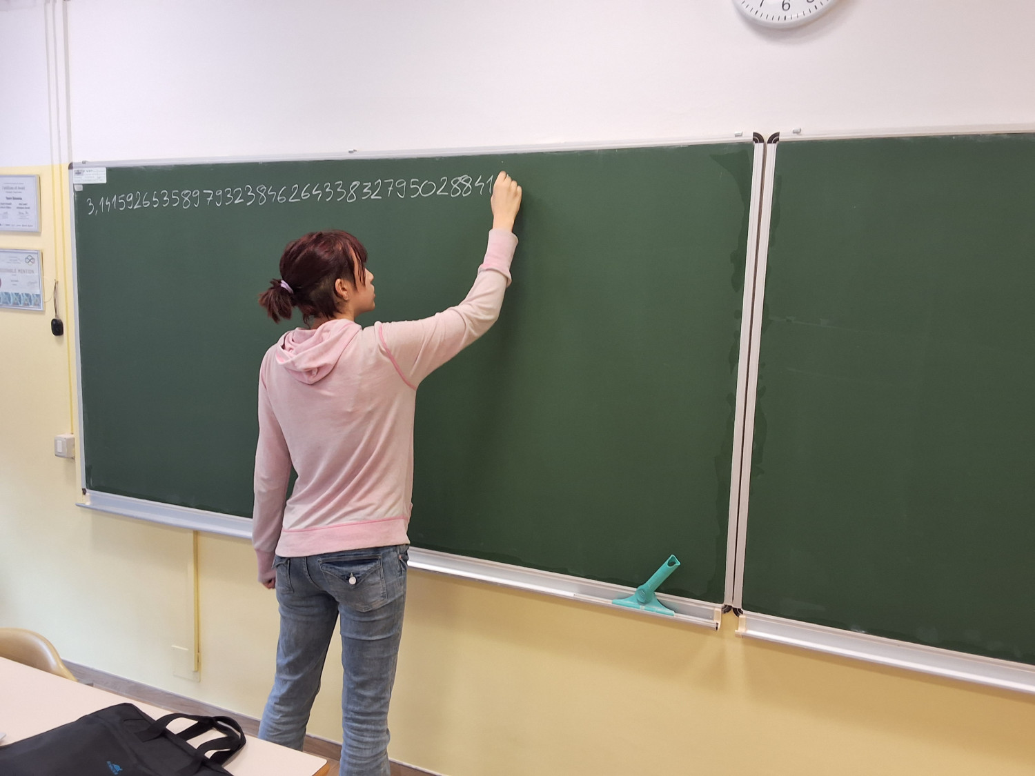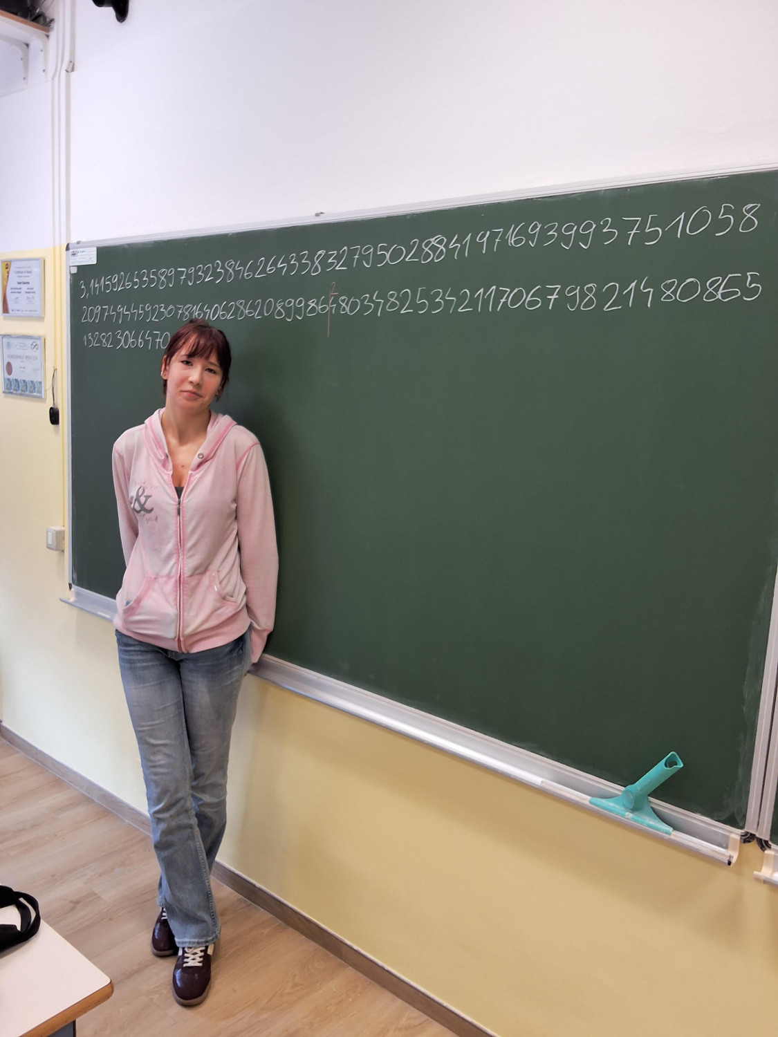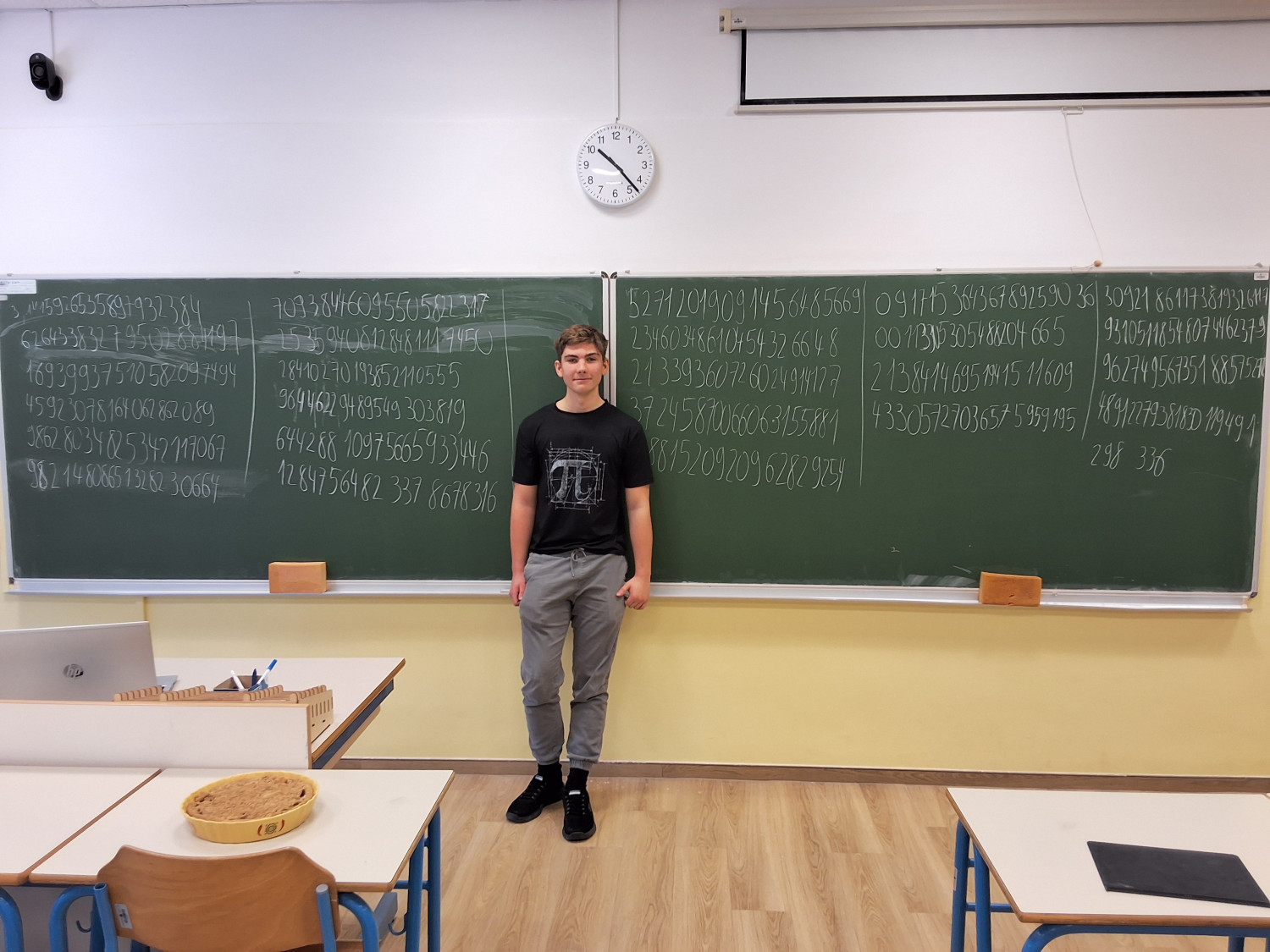 Vid Markič je pokazal izjemno pripravljenost in uspešno pravilno zrecitiral kar 505 decimalk števila π, kar je zelo dober rezultat in zahteva veliko vaje ter koncentracije. Druga udeleženka, Jerca Eržen, je prav tako pogumno sodelovala in uspela pravilno povedati 82 decimalk števila π. Zmagovalec je za zmago prejel doma pečeno pito. Obema tekmovalcema čestitamo.