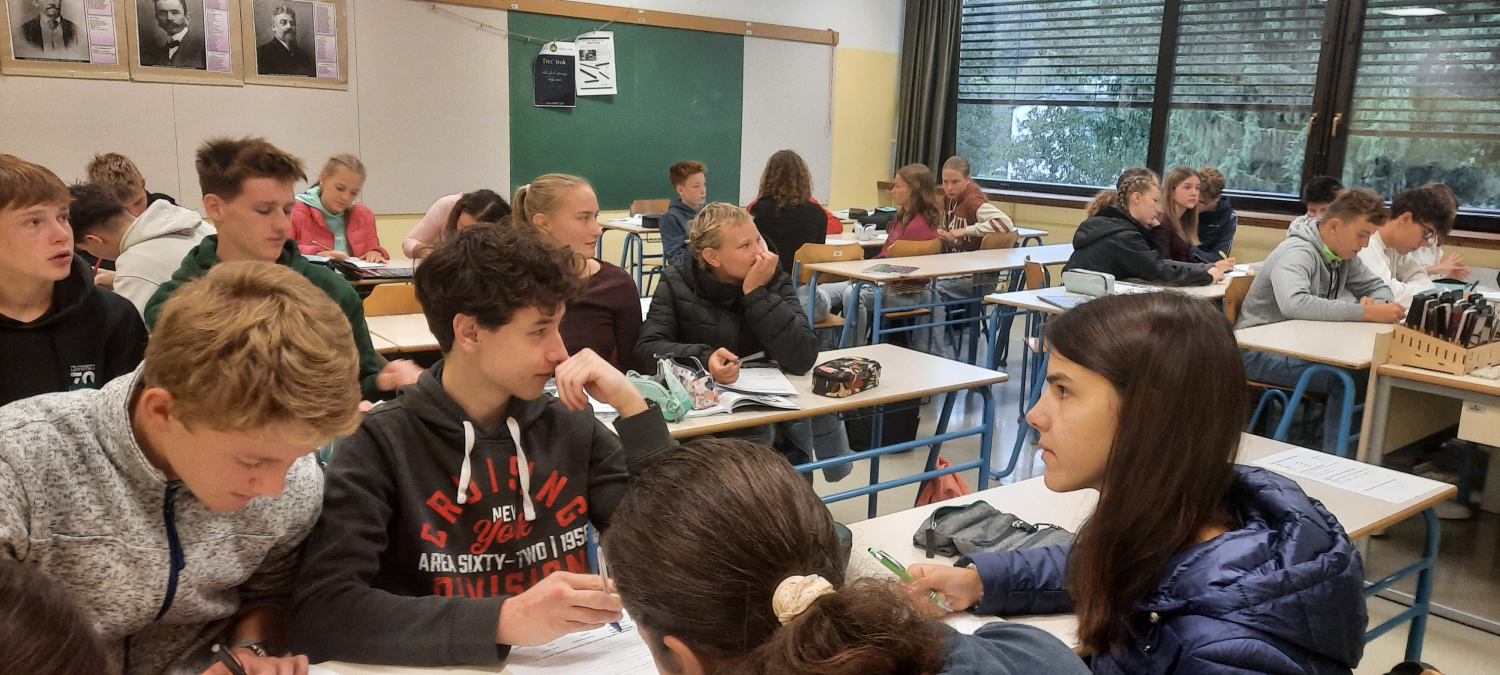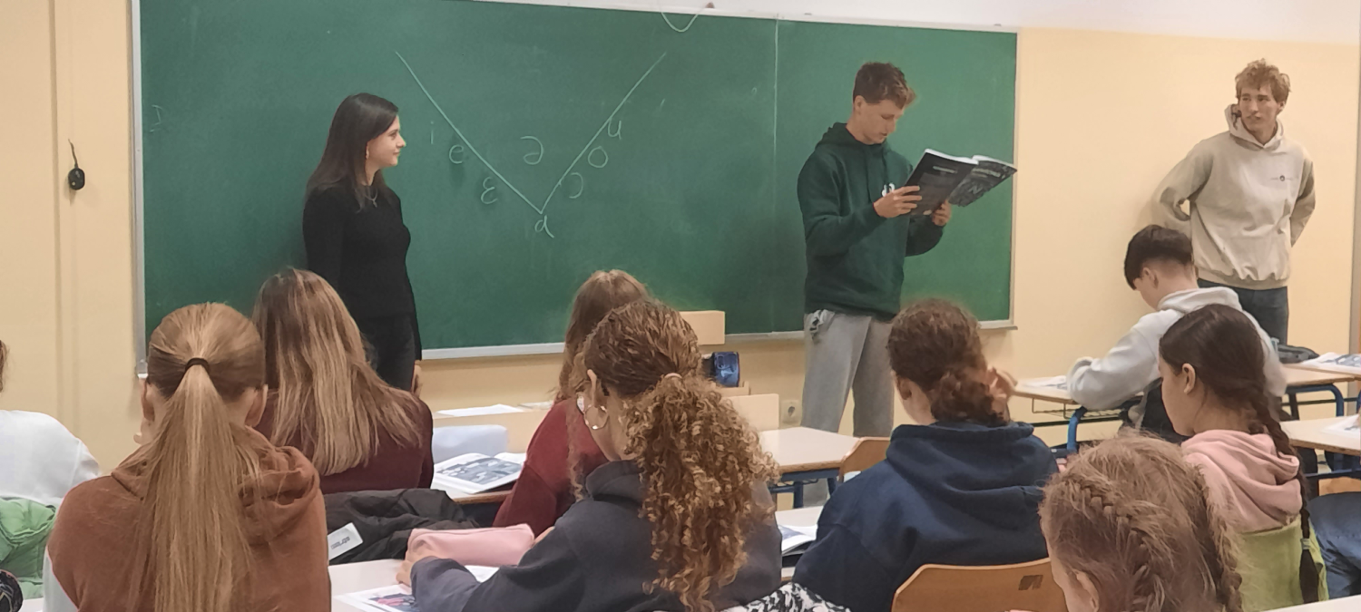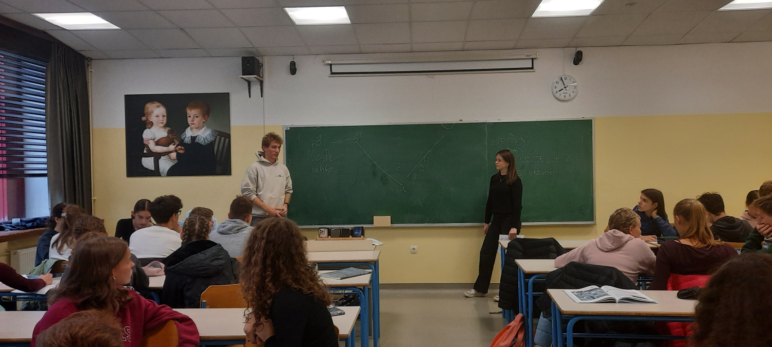 V nedeljo, 5. oktobra, smo obeleževali svetovni dan učiteljev, zato sta se pri uri slovenščine v 1. a-razredu v ponedeljek v vlogi učiteljev preizkusila dijaka 4. a – Jakob Janez Markelj in Anamarija Eržen. Cilj ure je bil ponoviti snov glasoslovja, ki jo obravnavamo. Uro smo začeli tako, da smo dijaki brali besedilo z različnimi naglasi, nato pa smo se o teh naglasih pogovorili, dijaka v vlogi profesorjev pa sta nam še enkrat razložila samoglasniški trikotnik. Po uvodnem delu smo se razdelili v skupine ter dobili učne liste, ki smo jih s pomočjo razlage reševali po skupinah. Nato smo rešitve še pregledali.