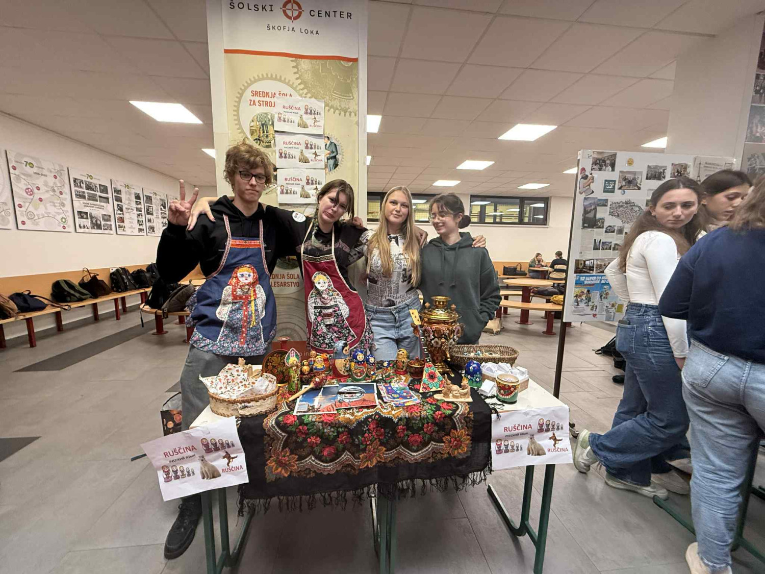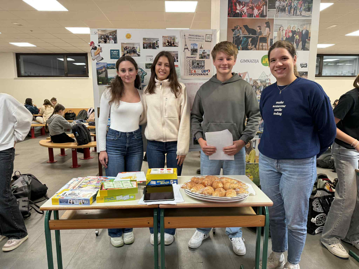 V petek, 26. septembra 2025, smo na Gimnaziji Škofja Loka obeležili evropski dan jezikov. Med 4. in 5. uro so dijaki v šolski avli pripravili stojnice za vse jezike, ki jih poučujemo: slovenščina, angleščina, nemščina, španščina, ruščina, francoščina in latinščina. Dijaki so na stojnicah pripravili različne izzive, kvize in vprašanja s simboličnimi nagradami. Pripravili so tudi značilno hrano države, v kateri govorijo jezik, ki je bil predstavljen na stojnici.