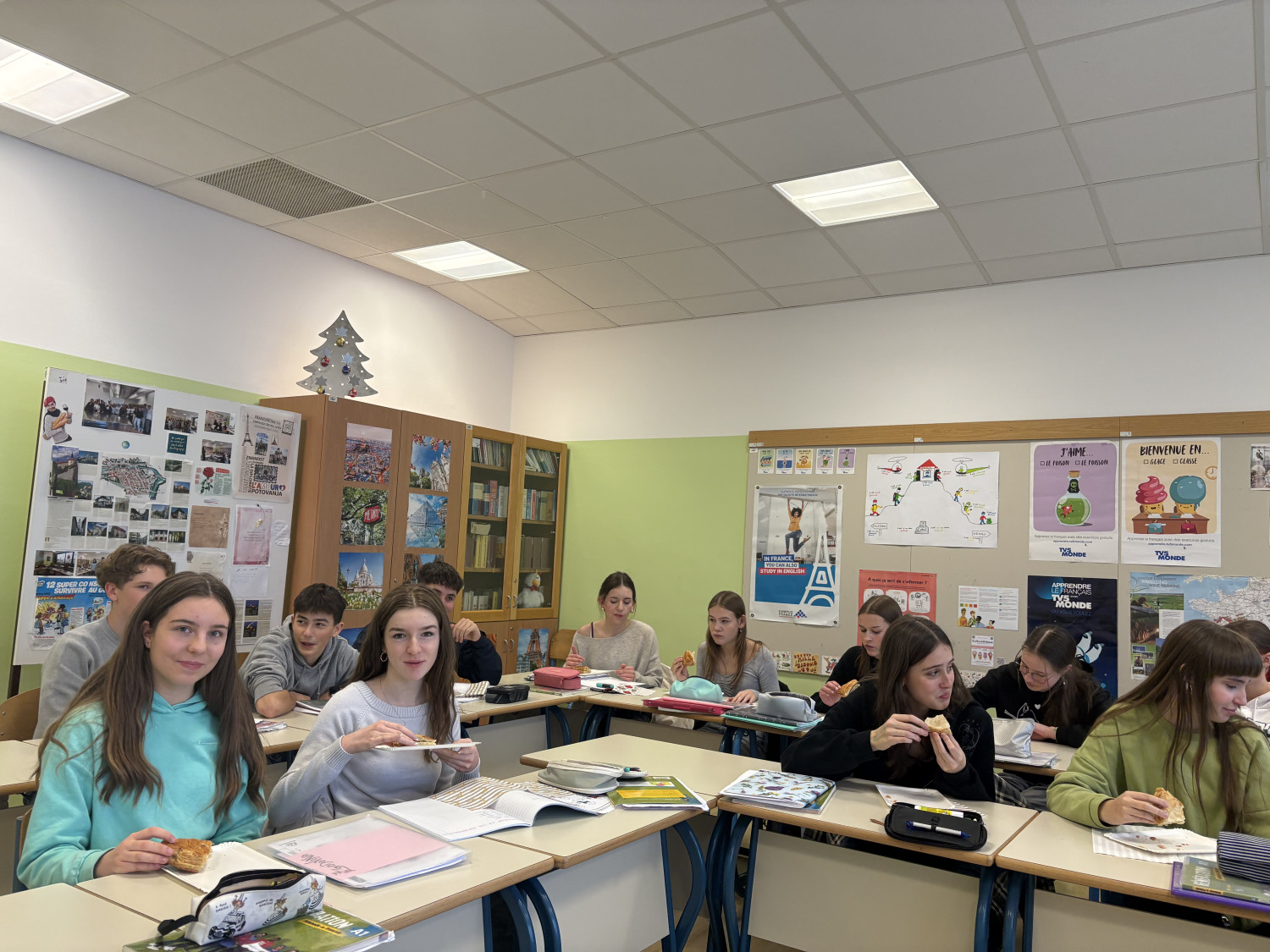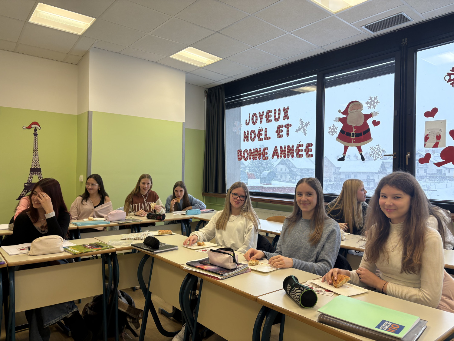 Na eni od slik pa lahko vidite tudi »bûche de NOËL« (čokoladno božično rulado v obliki debla), ki so jo naši dijaki po francoskem receptu naredili sami. »Félicitations«!