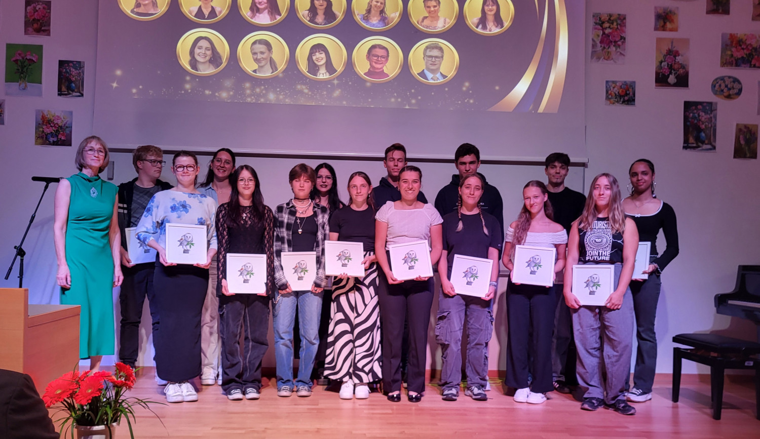 Po uvodni izvedbi pesmi Gaudeamus Igitur in nagovoru ravnateljice ter župana smo maturantom še enkrat iskreno čestitali za uspešno opravljeno maturo, jim segli v roke ter jim kot simbol zrelosti podarili rdeče nageljne. Zaželeli smo jim veliko uspeha na nadaljnji študijski poti in v življenju. Posebne čestitke je prejelo 18 zlatih maturantov in diamantna maturantka Sara Ferreira.