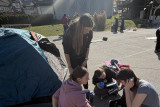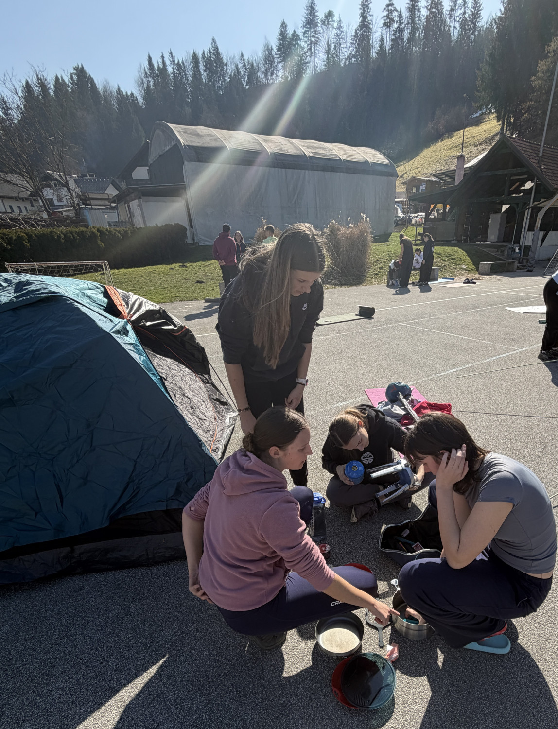 Pred kosilom so dijaki na igrišču za šolo postavili tudi šotore. Nekateri so jih postavili hitro in brez zapletov, drugi so ob tem hitro ugotovili, da je postavljanje šotora lahko težavno opravilo. Prav takšne izkušnje pa so pomemben del priprav na odpravo. Sledila je še priprava kosila na gorilnikih. Dijaki so preizkusili, kako poteka kuhanje na odpravi, obenem pa smo pregledali tudi del njihove opreme in se pogovorili o tem, kaj se je izkazalo za dobro izbiro ter kaj bi bilo smiselno še izboljšati.