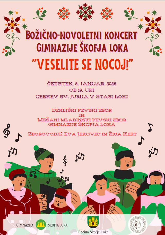 Gimnazija Škofja Loka vabi na božično-novoletni koncert, na katerem se bosta predstavila Dekliški pevski zbor in Mešani mladinski pevski zbor Gimnazije Škofja Loka.