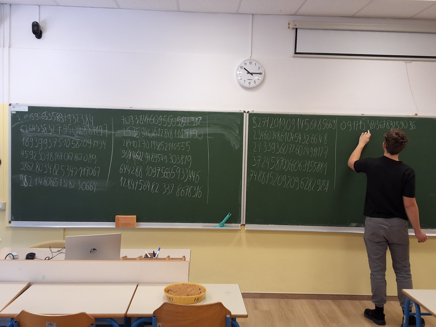 Vid Markič je pokazal izjemno pripravljenost in uspešno pravilno zrecitiral kar 505 decimalk števila π, kar je zelo dober rezultat in zahteva veliko vaje ter koncentracije. Druga udeleženka, Jerca Eržen, je prav tako pogumno sodelovala in uspela pravilno povedati 82 decimalk števila π. Zmagovalec je za zmago prejel doma pečeno pito. Obema tekmovalcema čestitamo.