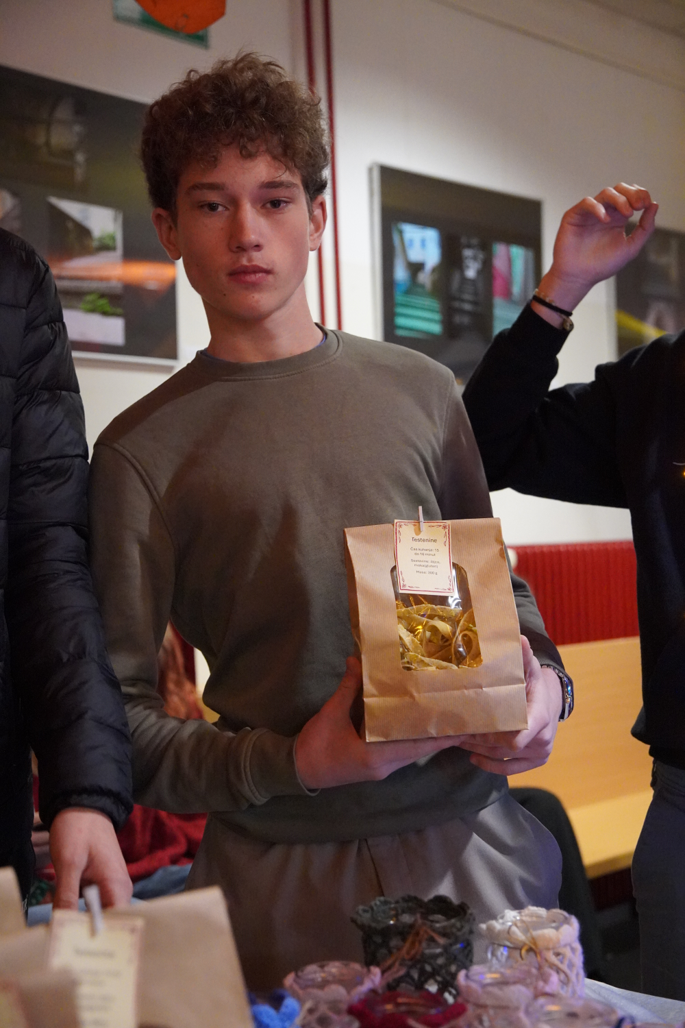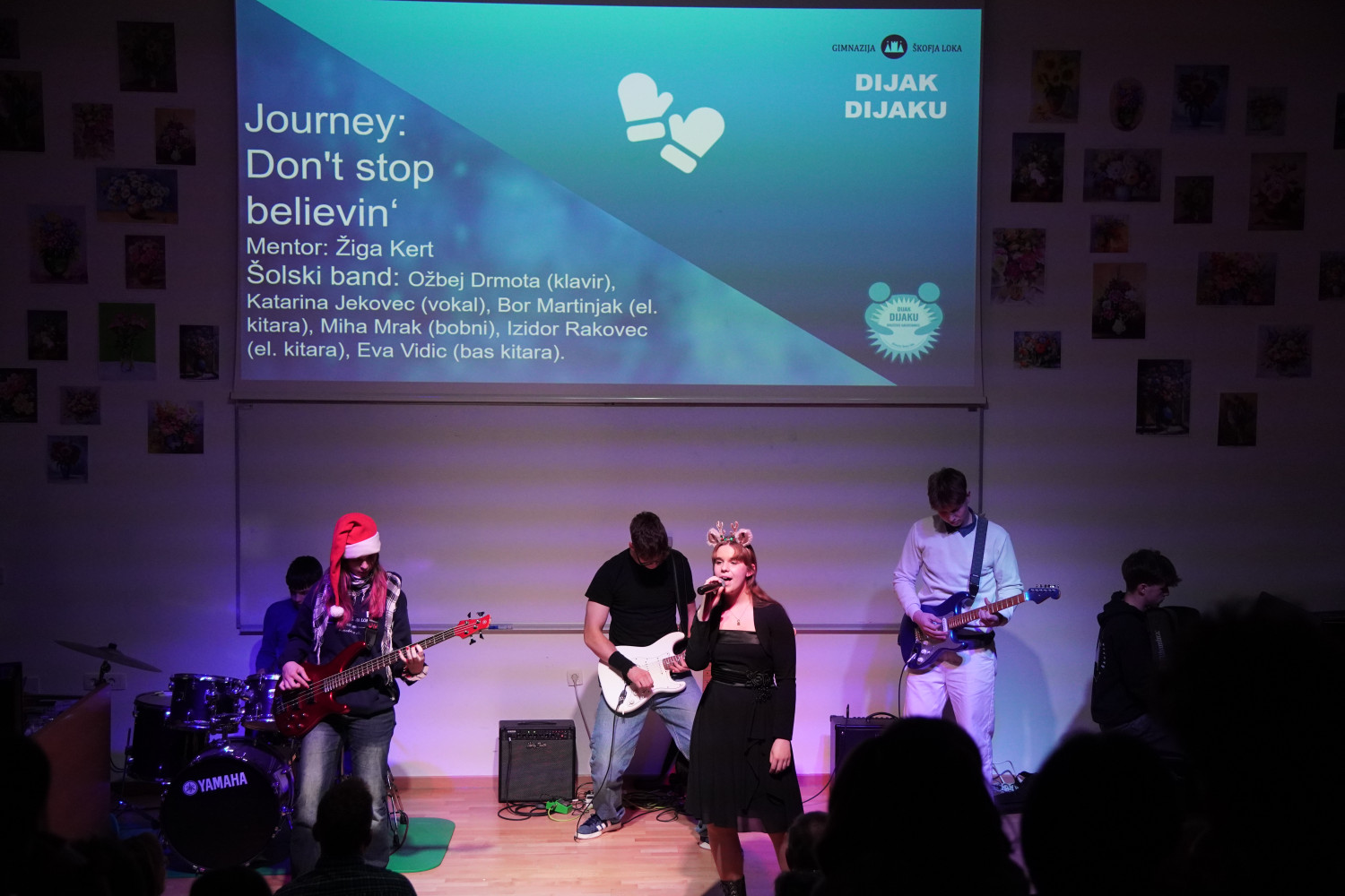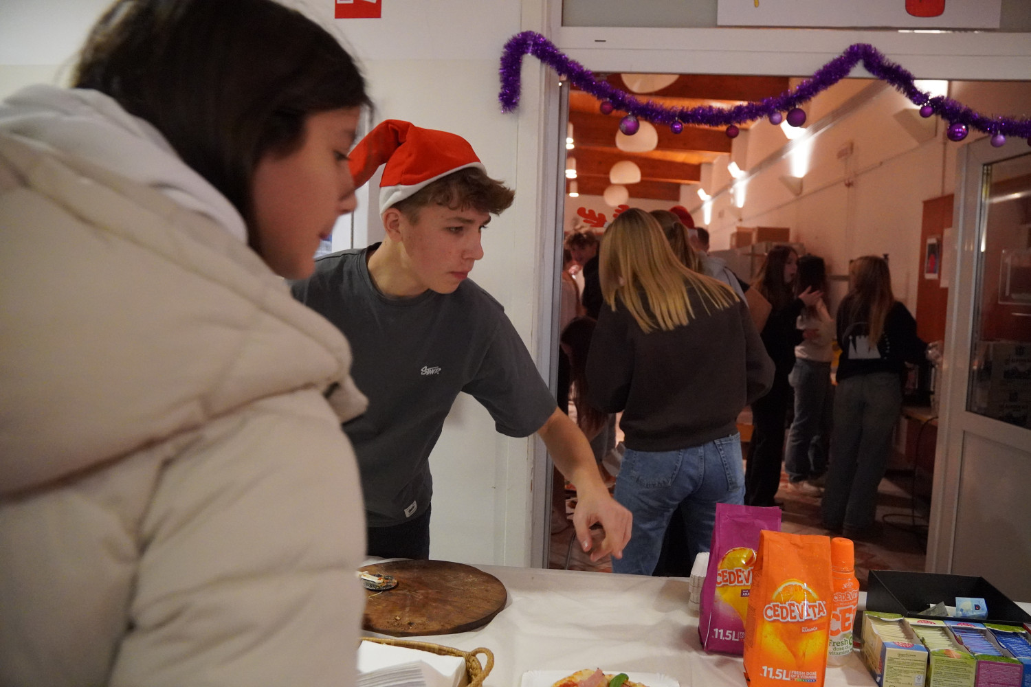 Na dan prižiga prazničnih lučk – v petek, 28. decembra – smo na Gimnaziji Škofja Loka pripravili dobrodelno prireditev Dijak dijaku s prazničnim sejmom, ki vsako leto obogati sklad Gaudeamus, namenjen pomoči dijakom, ki težko pokrijejo stroške, nastale med šolanjem. Obiskovalci so lahko izbirali med venčki, piškoti, nakitom, voščilnicami, božičnim žitom, čaji, marmelado in se posladkali s pecivom in vročo čokolado, bolj lačni pa so posegli po slastni pici. Sledil je program, kjer so se dijaki predstavili s točkami v francoščini, nemščini, ruščini, španščini, latinščini in angleščini. V kino nas je popeljala impro skupina O.sti J.arej, za glasbo pa sta poskrbela šolski orkester in šolski bend, z dvema točkama so sodelovali tudi učenci OŠ Škofja Loka – Mesto. Dijaki drugih letnikov, njihovi razredniki in mentorji so pripravili prijeten večer, ki je lep uvod v praznični december.