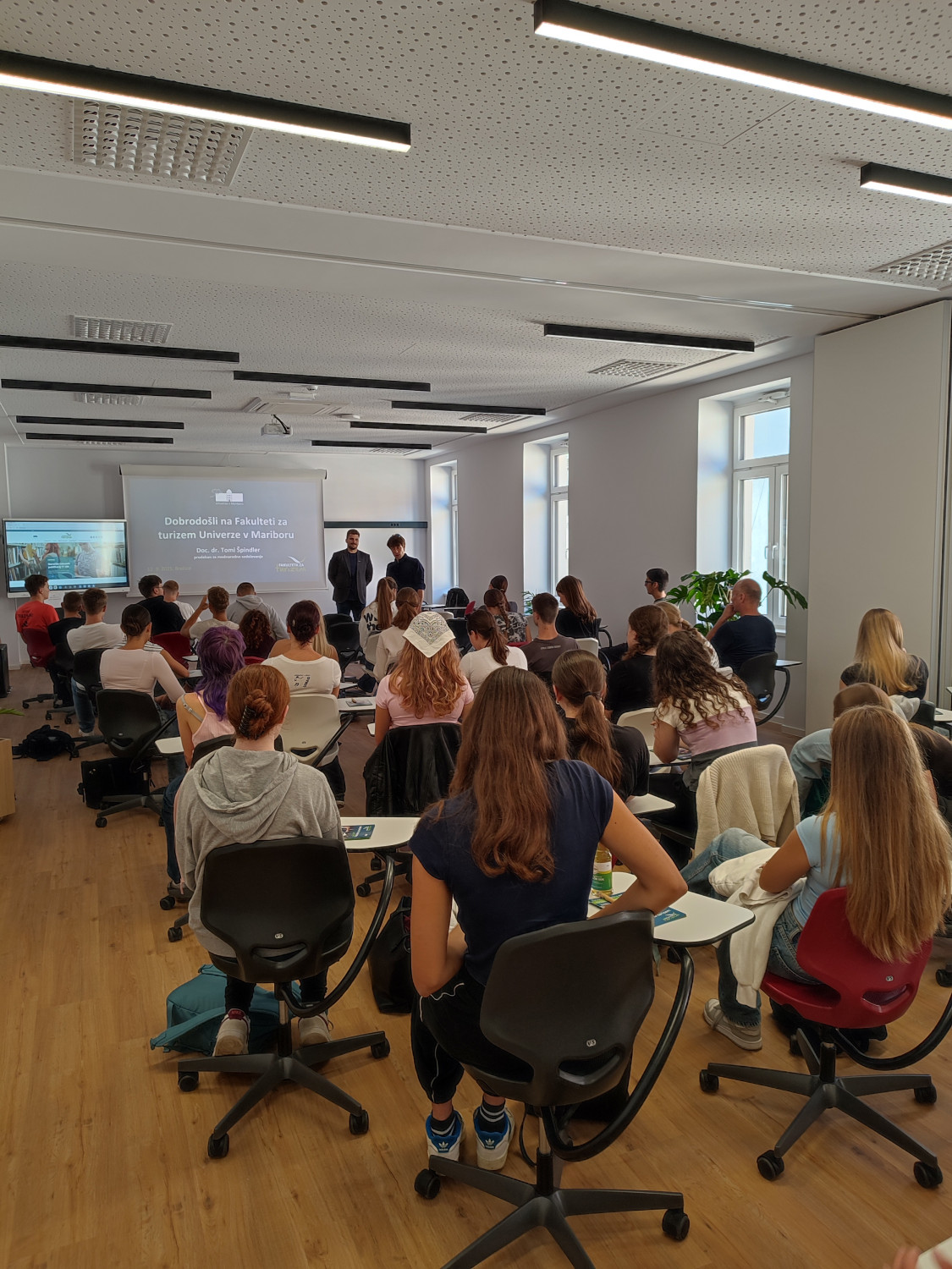Najprej so si ogledali delovanje tamkajšnje hidroelektrarne, nato pa jih je geograf, asist. Nejc Pozvek s Fakultete za turizem, ob številnih zanimivih in koristnih informacijah o ožjem in širšem območju popeljal po mestu do novih prostorov njihove fakultete, kjer so nam pripravili sprejem v popolnoma novi predavalnici, predstavitev študijskih programov in nagradni kviz. Dijaki so preizkusili tudi očala virtualne resničnosti ter si ogledali namizno igro na temo trajnostnega turizma v Julijskih Alpah, ki so jo zasnovali na fakulteti. Pripravili so tudi pogostitev, ob kateri so lahko dijaki neformalno poklepetali s tamkajšnjimi profesorji.