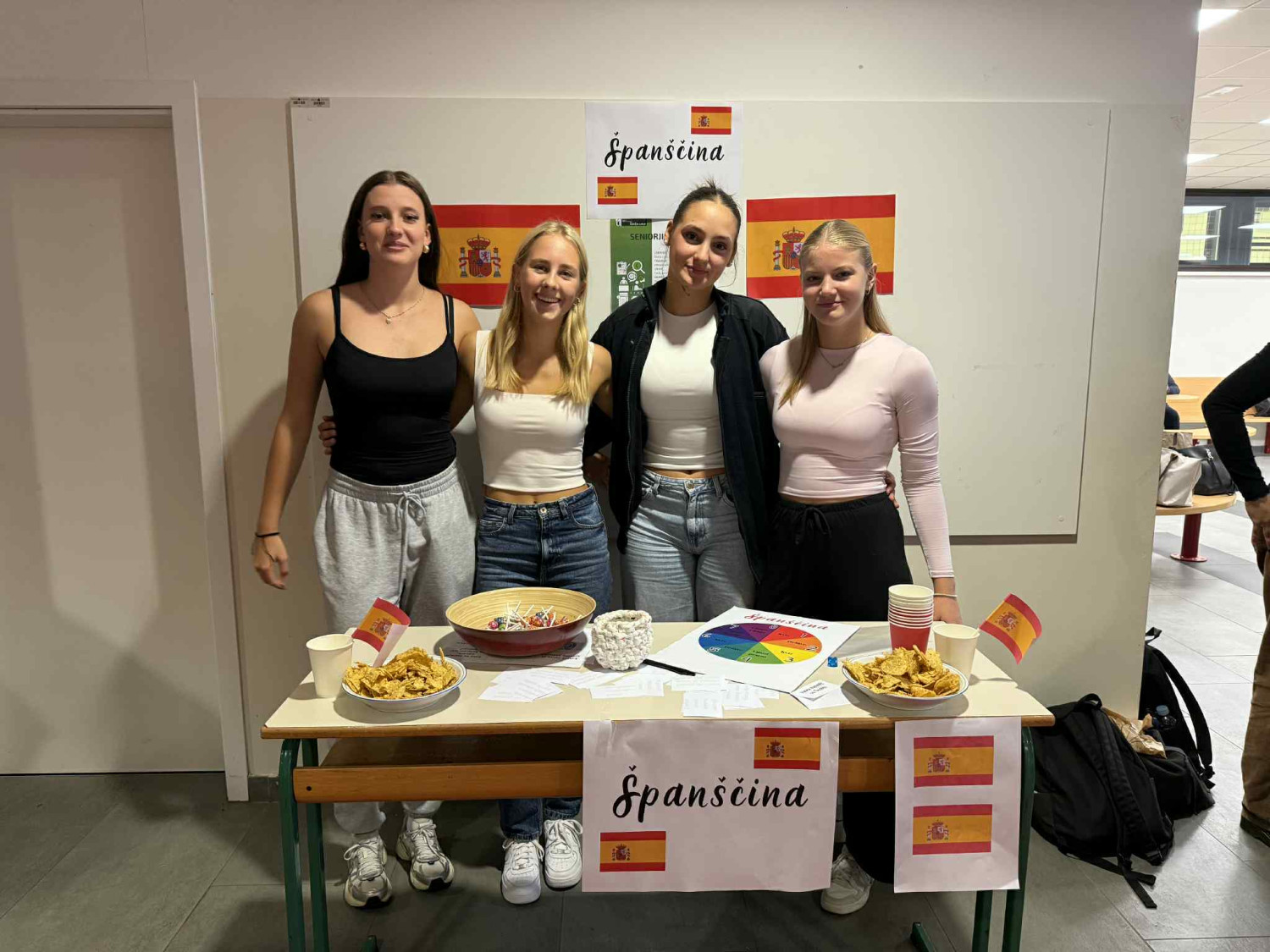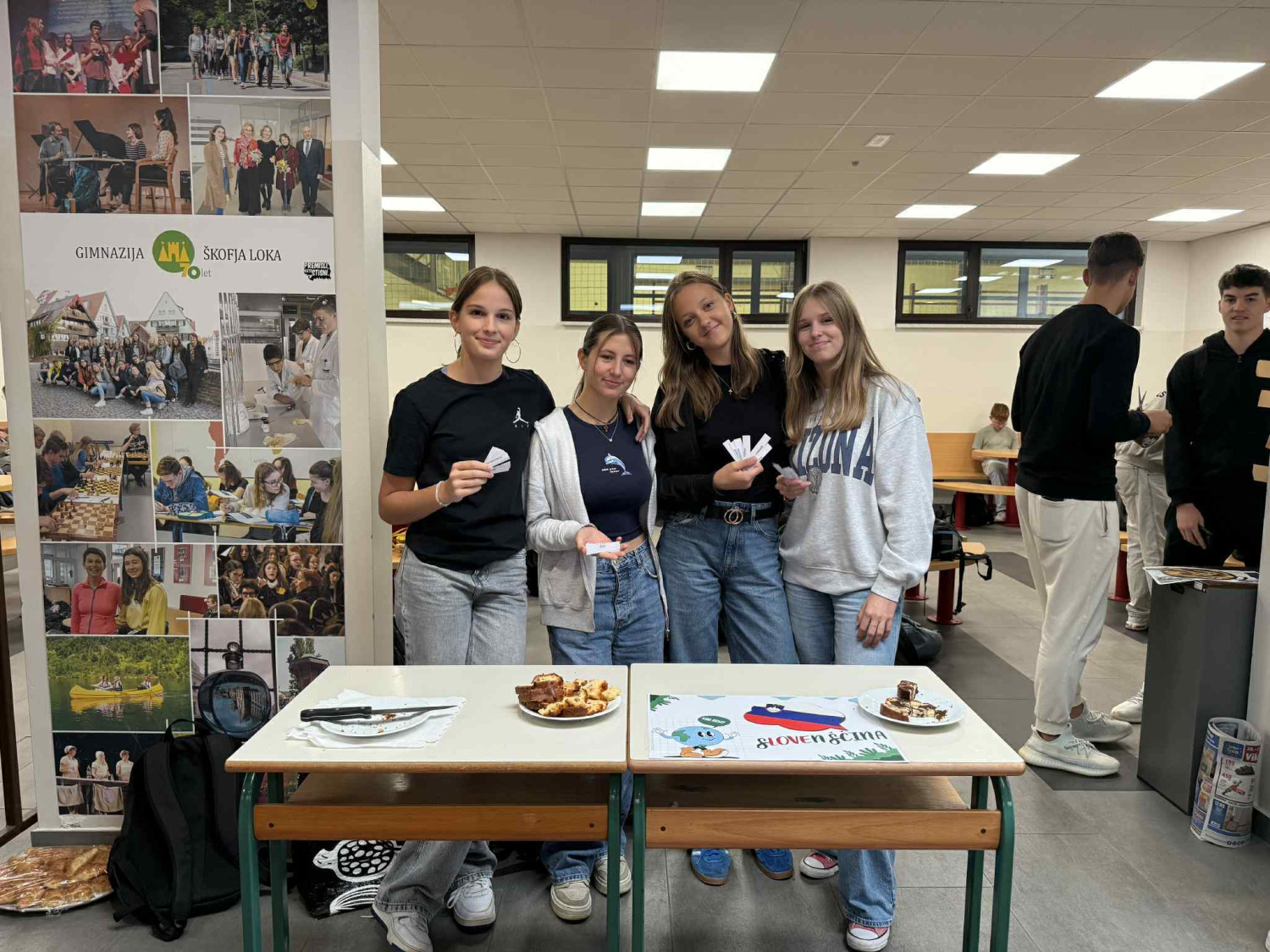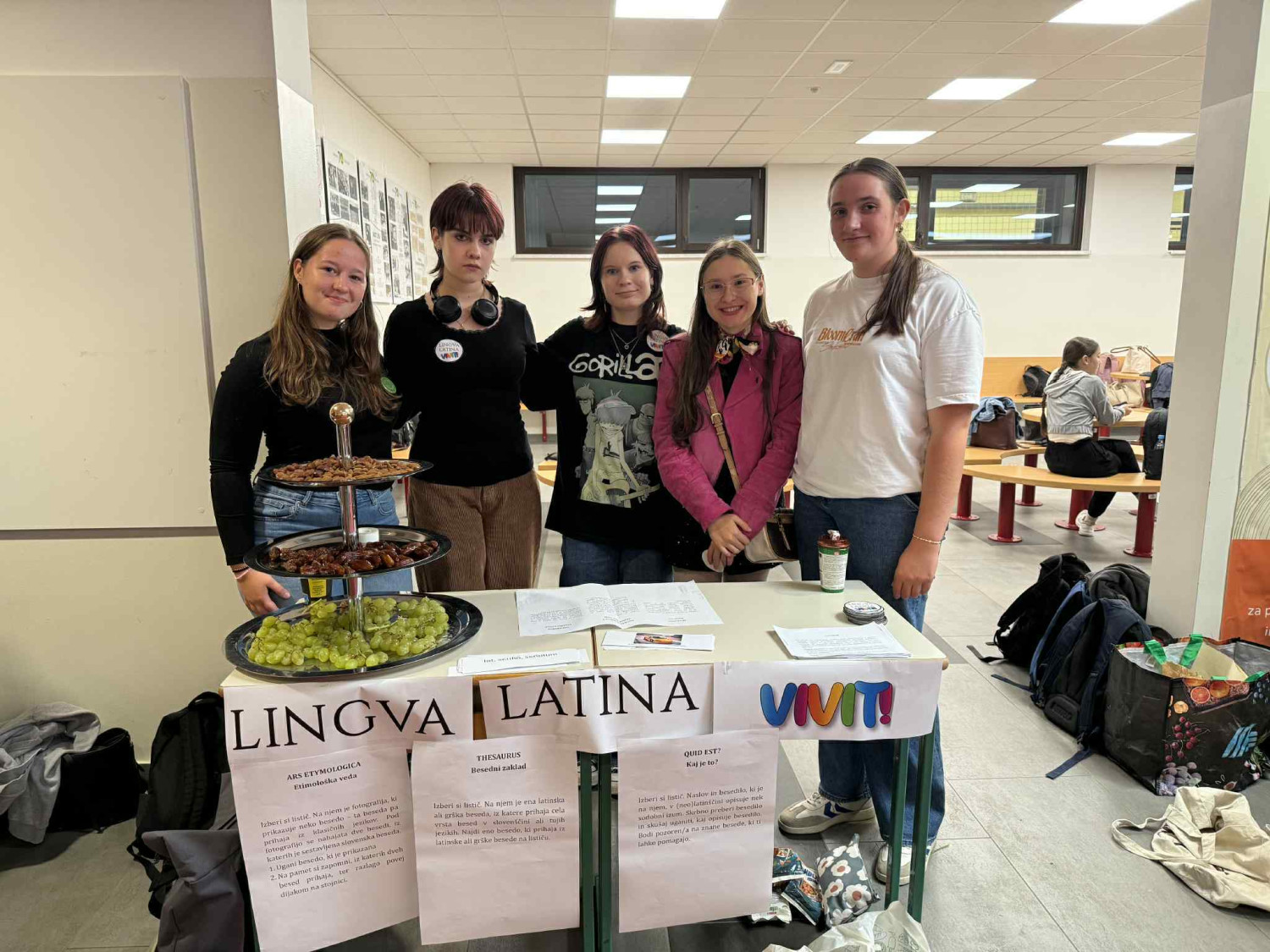 V petek, 26. septembra 2025, smo na Gimnaziji Škofja Loka obeležili evropski dan jezikov. Med 4. in 5. uro so dijaki v šolski avli pripravili stojnice za vse jezike, ki jih poučujemo: slovenščina, angleščina, nemščina, španščina, ruščina, francoščina in latinščina. Dijaki so na stojnicah pripravili različne izzive, kvize in vprašanja s simboličnimi nagradami. Pripravili so tudi značilno hrano države, v kateri govorijo jezik, ki je bil predstavljen na stojnici.