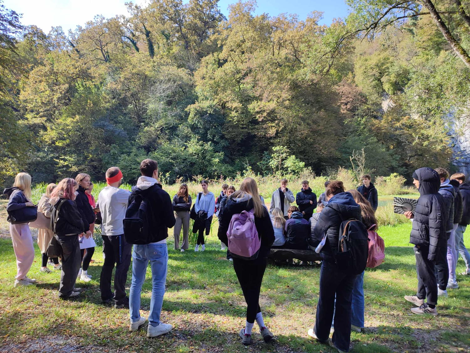 V petek, 3. 10., in v soboto, 4. 10. 2025, so se dijaki 4. letnika v sklopu maturantske geografske ekskurzije odpravili raziskovat kraški svet z namenom poglabljanja znanja, spoznavanja slovenske pokrajine na terenu ter praktične izdelave dveh fizično- in dveh družbenogeografskih terenskih vaj. V petek smo se odpeljali v Belo krajino, kjer smo ugotavljali turistični potencial Semiča. Po skupinah smo izdelali enominutni promocijski posnetek in turistični letak. Ogledali smo si tudi izvir reke Krupe, ki je znan po veliki onesnaženosti zaradi odlaganja odpadnih kondenzatorjev. S pripomočki iz laborantskega kovčka smo preverili, ali je voda zares onesnažena in s čim. Med vožnjo smo se lahko mnogokrat prepričali, da se res nahajamo na kraškem površju, saj smo videli ogromno vrtač in uval. V soboto pa smo preizkusili »notranjski mraz«, saj smo si najprej ogledali kraške požiralnike na Ponikvah in preverili svoje orientacijske zmožnosti, nato pa smo si ogledali še Bloško jezero in, prav tako s pomočjo izdelave promocijskega posnetka in turističnega letaka, pripravili inovativne izdelke za turistično promocijo območja. Nekaj primerov si lahko ogledate v galeriji. Ekskurziji sta bili zanimivi in sproščeni in prav zato smo se na poti tudi ogromno novega naučili. |