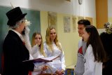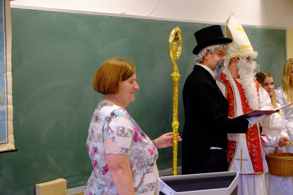 Danes je vse letnike na Gimnaziji Škofja Loka v spremstvu parkeljnov in angelov obiskal Sv.Miklavž. Nagovoril je dijake, okaral njihove slabe navade in jih spodbudil k lepemu, dostojnemu obnašanju in seveda k učenju. Za protokol in pravilen potek obiska je ves čas skrbel pisar, ki je imel v svoji zlati knjigi zelo natančne zapise o posameznih dijakih in tudi učiteljih. Tisti, o katerih je bilo napisno največ, so se morali odkupiti z molitvicami, pesmijo ali s plesom. No, na koncu pa smo bili vsi deležni sladkih dobrot. Hvala Miklavžu in upamo, da pride tudi drugo leto.